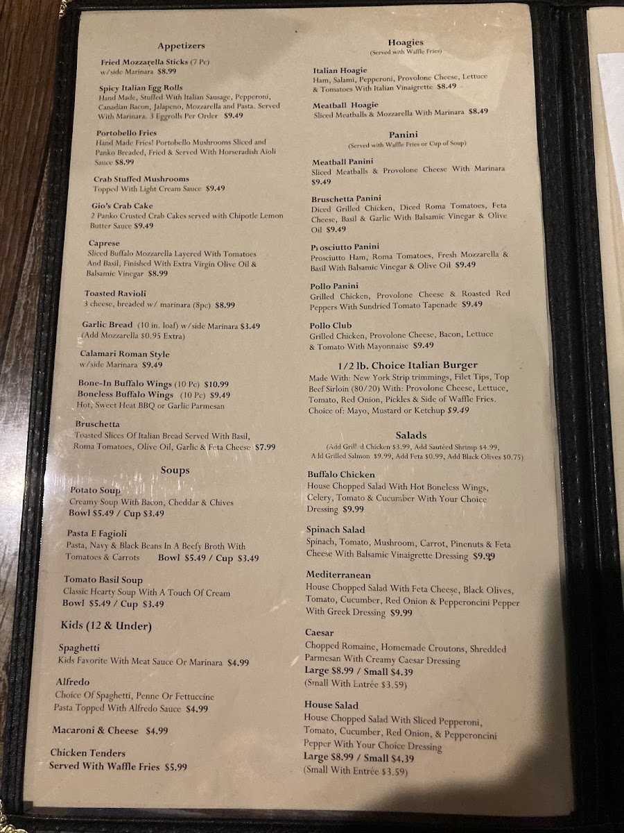 As you step into Gio's, you're greeted by a cozy ambiance that combines small-town charm with an elegant touch. The friendly staff creates an immediate sense of belonging, making it easy to feel at home. Whether you're dining in or opting for takeout, the service is consistently attentive, ensuring that your experience is nothing short of delightful.